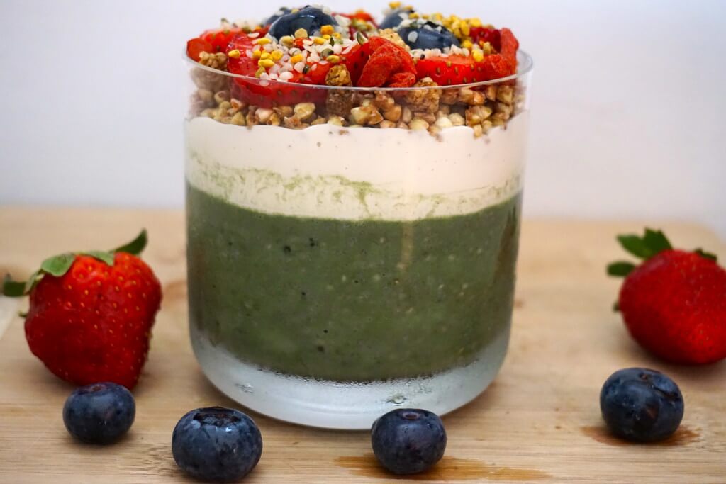 This is another very simple recipe to follow. Just mix the chia, flax, cacao, protein powder and spirulina with the plant-based milk. Leave it to rest for a few minutes so the components can soak in the milk. Finally, add the rest of the ingredients on top and enjoy!